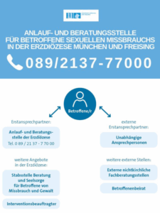 Das Erzbistum München und Freising ermutigt ebenfalls alle direkt oder indirekt Betroffenen, sich zu melden, um alles auf den Weg zu bringen, was erforderlich ist, um geschehenes Unrecht aufzuarbeiten und drohendes abzuwenden. Dazu gibt es eine wichtige Telefonnummer (siehe Grafik; beachten Sie auch das Organigramm über die passenden Anlaufstellen).